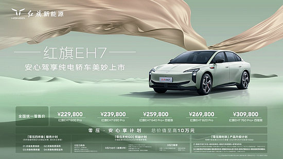 3月20日,紅旗新能源在深圳市民廣場舉行“安心駕享·紅旗EH7上市發(fā)布會”,紅旗新能源品牌首款戰(zhàn)略車型——“安心駕享純電轎車”紅旗EH7正式發(fā)布,全國統(tǒng)一零售價(jià)為22.98萬-30.98萬元,特別推出的“零壓安心享”計(jì)劃,紅旗EH7用戶最高可享價(jià)值10萬元的權(quán)益。[