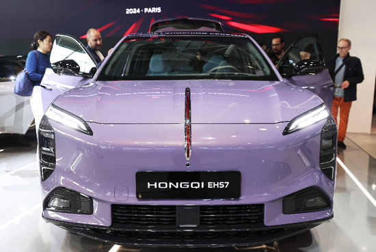 10月14日,人們?cè)诜▏屠璺矤栙愰T展覽中心舉行的2024巴黎車展媒體開放日上參觀紅旗展臺(tái)。新華社記者 高靜 攝