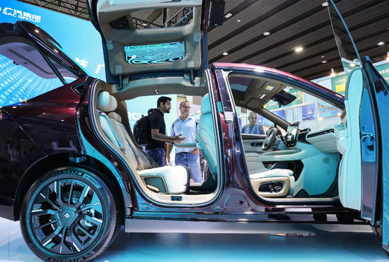(資料圖片)采購(gòu)商在參觀今年廣交會(huì)上展示的中國(guó)新能源汽車。新華社記者 劉大偉 攝