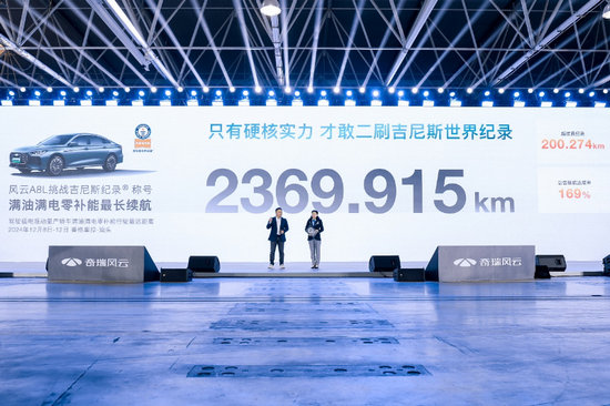 此次發(fā)布會上,風云A8L項目組,創(chuàng)造了“駕駛插電混動量產(chǎn)轎車滿油滿電零補能行駛最遠距離”的吉尼斯世界紀錄稱號,達成了2369.915公里的成績。