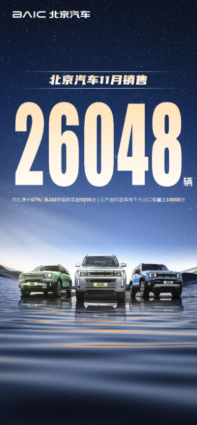 進入2024年底,北京品牌的市場銷量節(jié)節(jié)飆升。數(shù)據(jù)顯示,北京品牌9月銷量同比增長29%,10月同比增長120%,11月同比增長67%;BJ30連續(xù)3個月單月銷量超過5,000臺,成為方盒子市場爆品;1-11月海外銷量同比增長47%,連續(xù)兩個月海外單月銷量突破10,000輛。