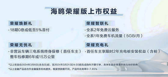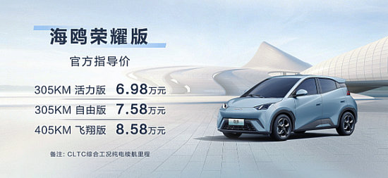 比亞迪海鷗自去年4月上市以來(lái)持續(xù)熱銷(xiāo),2023年以年銷(xiāo)280217輛的成績(jī)獲A00級(jí)市場(chǎng)年度銷(xiāo)冠。承襲冠軍品質(zhì)與高能實(shí)力,3月6日,海鷗榮耀版正式上市,官方指導(dǎo)價(jià)格為6。98萬(wàn)元-8。58萬(wàn)元。海鷗榮耀版增色降價(jià),新增北冰藍(lán)外觀+深海藍(lán)內(nèi)飾配色,以全新的配色方案與多彩個(gè)性體驗(yàn),豐富用戶(hù)的購(gòu)車(chē)選擇,更好滿(mǎn)足用戶(hù)的個(gè)性化需求。