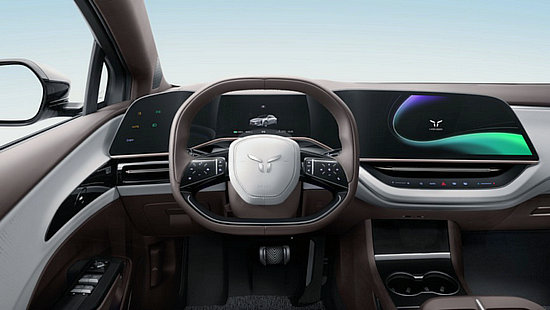 進(jìn)入車內(nèi),環(huán)抱懸浮的中控、喀納斯湖面漣漪般的紋理以及將天空盡收眼底的天幕,宛如一幅人車自然相融共生的畫卷,“山環(huán)水抱、天光云影”意境之美詮釋得恰到好處。
