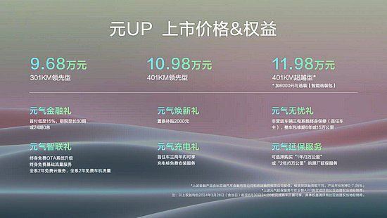 3月26日,比亞迪首款搭載e平臺3。0的A0級純電SUV——元UP正式上市。新車共有3個款型,官方指導價9。68萬元—11。98萬元。同時,官方還推出了元氣金融禮、元氣煥新禮、元氣無憂禮、元氣智聯(lián)禮、元氣充電禮、元氣延保服務六大上市權(quán)益。