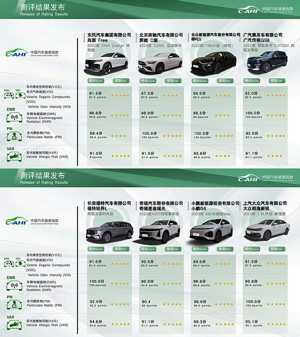 本次發(fā)布的C-AHI中國汽車健康指數(shù)2023年第五批次測評結(jié)果涵蓋了嵐圖Free(2022款DNADesign純電版)、奔馳C級(2023款C200L運動轎車)、哪吒S(2022款1160小版(增程))、廣汽傳祺GS8(2022款領(lǐng)航系列2。0TGDI四驅(qū)至尊版)、福特銳界L(兩驅(qū)五座時尚型)、奇瑞星途瑤光(2023款400T四驅(qū)奢享版)、小鵬G6(2023款580長續(xù)航Max)、大眾朗逸新銳(2023款1。5L手動新逸版)8款車型,發(fā)布包括了車內(nèi)揮發(fā)性有機化合物與車內(nèi)氣味強度(VOC&VOI)、車輛電磁輻射(EMR)、車內(nèi)顆粒物(PM)、車內(nèi)致敏風險(VAR)四個板塊的測評結(jié)果。