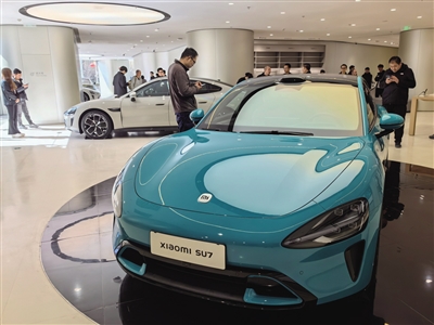 3月28日,在北京一家小米汽車零售門店內(nèi),消費(fèi)者在了解小米SU7汽車。 新華社記者 鞠煥宗 攝