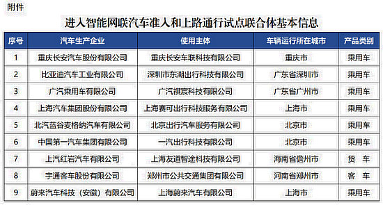 日前,工業(yè)和信息化部等四部門公布了一份名單,包含長安、比亞迪、廣汽、上汽、北汽、一汽、宇通、蔚來等在內(nèi)的9個汽車生產(chǎn)企業(yè)和使用主體組成的試點聯(lián)合體,將在北京、上海、廣州等7個城市展開智能網(wǎng)聯(lián)汽車準(zhǔn)入和上路通行試點。