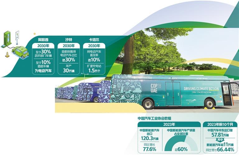 中東地區(qū)對電動汽車及配套設(shè)施的巨大需求對于中國車企無疑是重大利好和不可錯過的機遇。據(jù)中國汽車工業(yè)協(xié)會統(tǒng)計,2023年,中國新能源汽車出口120.3萬輛,同比增長77.6%。中國新能源汽車產(chǎn)銷量占全球的比重已超過60%。除了滿足國內(nèi)市場的需求,“出海”成為行業(yè)的一致動作,中東成為各大車企爭相開拓的重要市場。2023年前10個月,中國汽車中東出口量為57.81萬輛,同比增長32.61%,其中新能源汽車超11萬輛,同比增長66.44%。