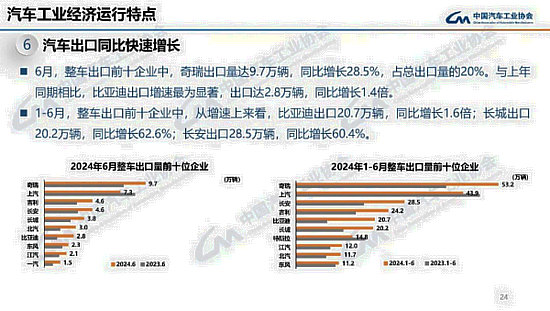 從企業(yè)市場(chǎng)層面數(shù)據(jù)來(lái)看,今年1-6月,汽車銷量排名前十位的汽車集團(tuán)中有6家實(shí)現(xiàn)了同比正增長(zhǎng)。包括比亞迪、奇瑞、長(zhǎng)安汽車、吉利汽車、東風(fēng)汽車等在內(nèi)的多家車企增速較為顯著,交出了一份令人滿意的成績(jī)單。