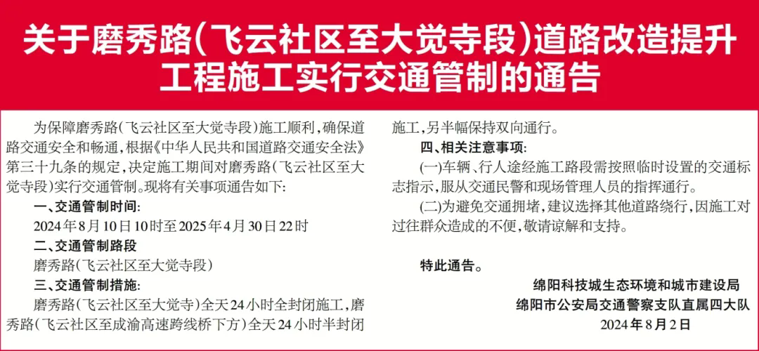 關(guān)于磨秀路(飛云社區(qū)至大覺寺段)道路改造提升工程施工實(shí)行交通管制的通告