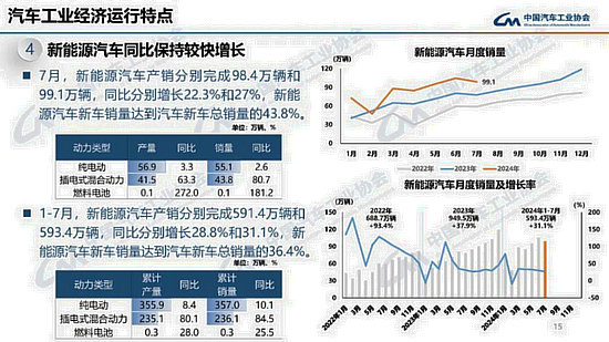 在新能源汽車方面,1-7月,新能源汽車產(chǎn)銷分別完成591.4萬輛和593.4萬輛,同比分別增長28.8%和31.1%,新能源汽車新車銷量達(dá)到汽車新車總銷量的36.4%。7月,新能源汽車產(chǎn)銷分別完成98.4萬輛和99.1萬輛,同比分別增長22.3%和27%,新能源汽車新車銷量達(dá)到汽車新車總銷量的43.8%。