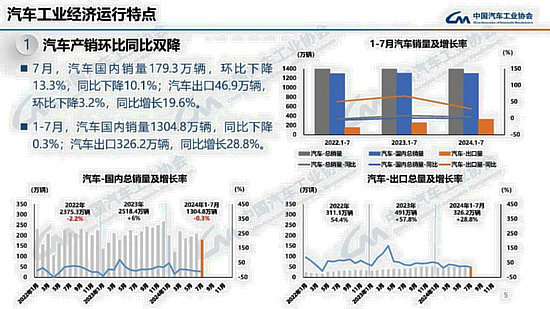 8月9日,中國汽車工業(yè)協(xié)會發(fā)布2024年7月汽車工業(yè)產(chǎn)銷情況。數(shù)據(jù)顯示,7月,汽車產(chǎn)銷分別完成228.6萬輛和226.2萬輛,環(huán)比分別下降8.8%和11.4%,同比分別下降4.8%和5.2%。據(jù)中國汽車工業(yè)協(xié)會分析,7月,車市進(jìn)入傳統(tǒng)淡季,部分廠家迎來高溫休假,產(chǎn)銷節(jié)奏有所放緩,整體市場表現(xiàn)相對平淡,環(huán)比同比均呈現(xiàn)下降。其中,乘用車和商用車產(chǎn)銷環(huán)比同比雙降,新能源汽車和汽車出口同比繼續(xù)保持較快增長。