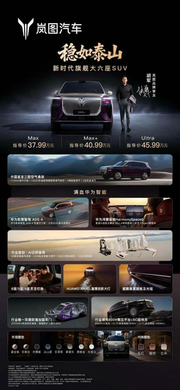11月18日,嵐圖汽車在深圳國(guó)際會(huì)展中心召開(kāi)以“爭(zhēng)峰”為主題的新車發(fā)布會(huì),正式發(fā)布新時(shí)代旗艦SUV——嵐圖泰山,新車共推出Max版、Max+版、Ultra版、黑武士版四大版型,官方指導(dǎo)價(jià)為37.99萬(wàn)元-50.99萬(wàn)元。同時(shí),還公布了總價(jià)值4.8萬(wàn)元的上市權(quán)益。