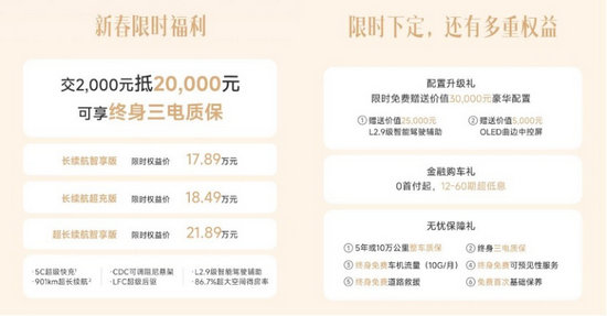 據(jù)悉,2月28日前下定嵐圖知音,用戶還能享受“2000元抵20000元”的福利政策,17.89萬起的價(jià)格就能入手。在此基礎(chǔ)上,嵐圖知音官方還推出包括終身三電質(zhì)保的三大購(gòu)車好禮。同時(shí),還能疊加2025年國(guó)補(bǔ)政策。