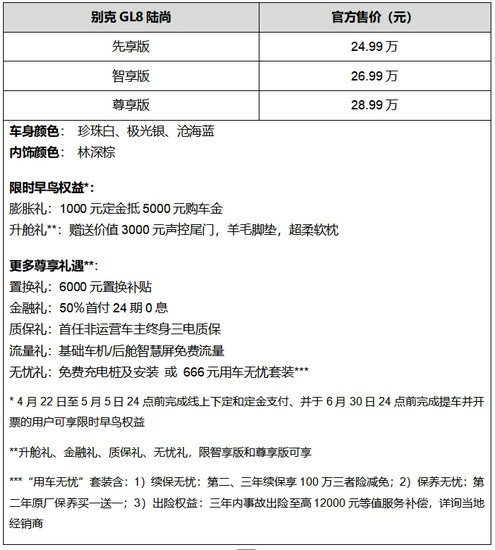 陸尚將采用“一口價(jià)”模式銷售,確保所有用戶都能享受到別克始終如一的頂尖品質(zhì)與高標(biāo)準(zhǔn)服務(wù)。即日起,用戶可通過(guò)別克官網(wǎng)、iBuick App、Buick小程序、別克抖音直播間,或別克全國(guó)授權(quán)經(jīng)銷商門店下定,可享受豐厚購(gòu)車權(quán)益。其中,5月5日24點(diǎn)前完成線上下定和定金支付,并于6月30日24點(diǎn)前完成提車并開(kāi)票的用戶更可享“早鳥(niǎo)”權(quán)益,包括:定金膨脹禮,下定支付1,000元抵5,000元購(gòu)車款;購(gòu)智享版、尊享版車型享“升艙禮”,免費(fèi)升級(jí)價(jià)值3,000元聲控尾門、羊毛腳墊和頭枕。