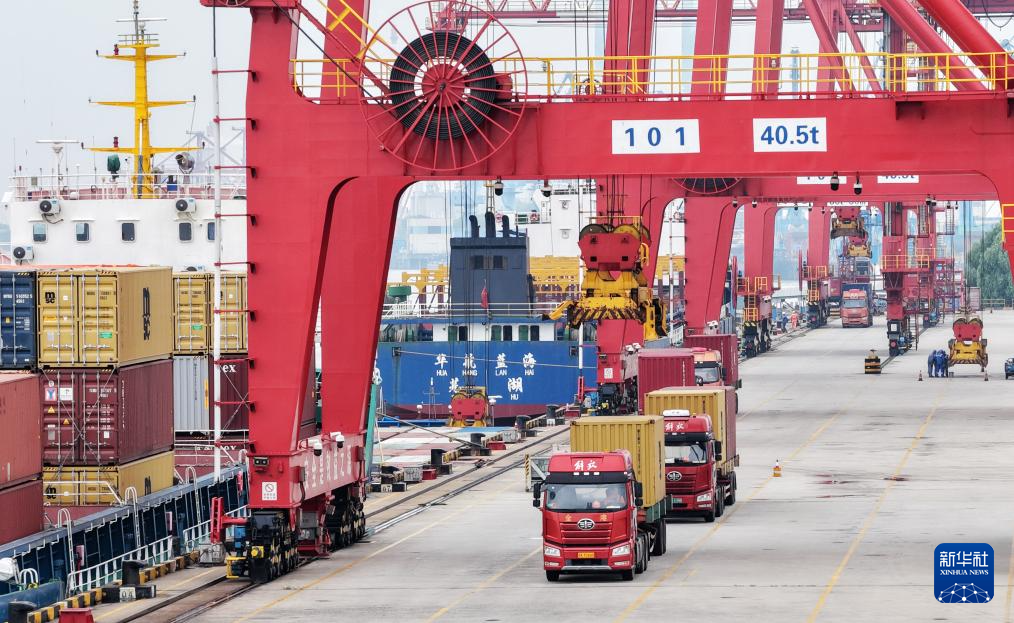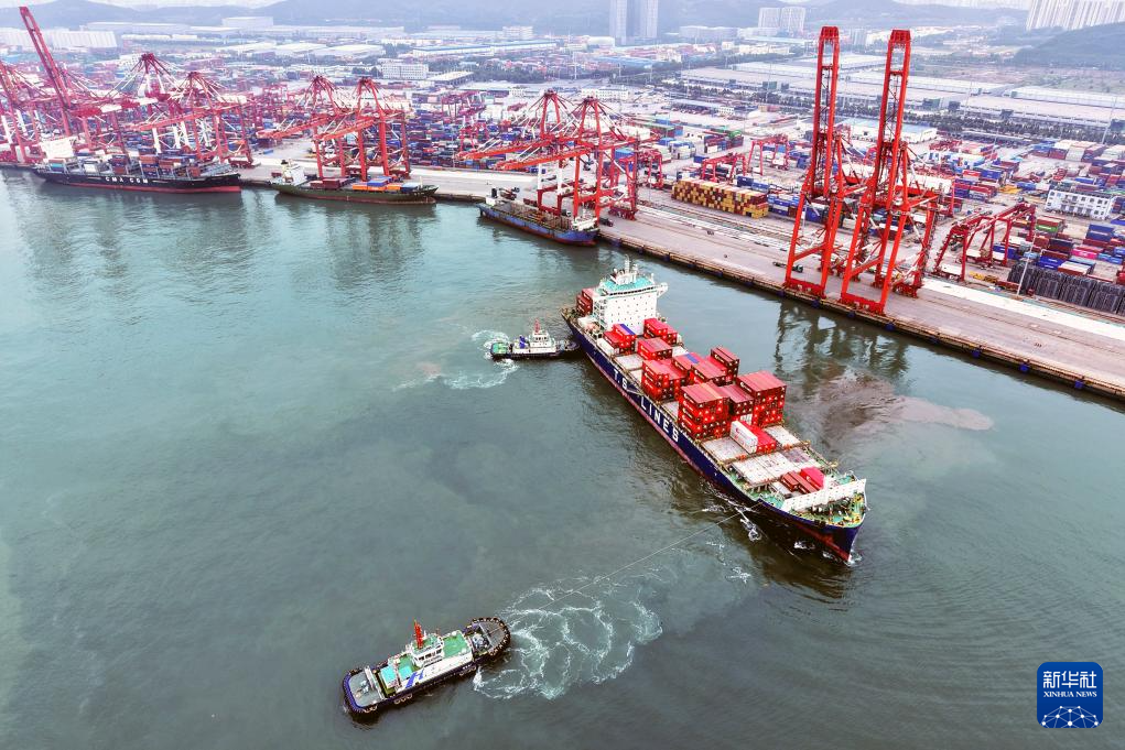 9月8日,在山東港口集團(tuán)青島港,一艘裝載外貿(mào)集裝箱的貨輪駛離泊位(無人機(jī)照片)。