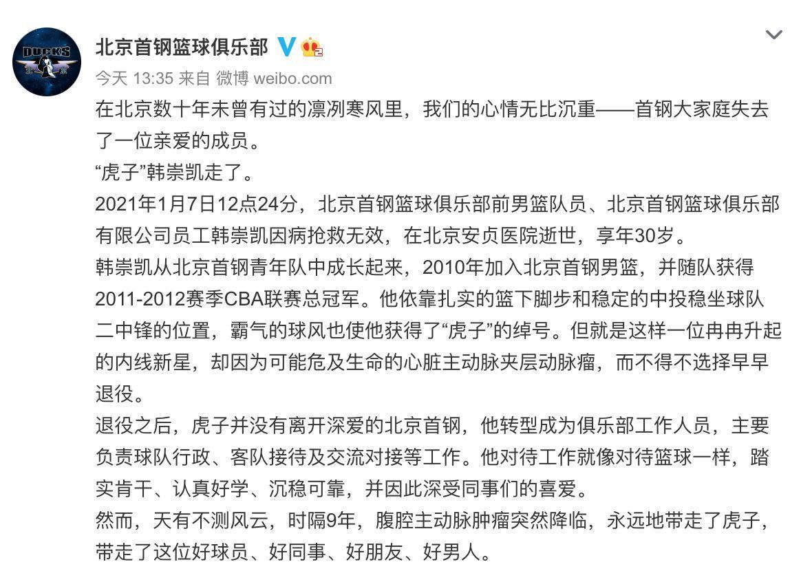 新華網(wǎng)成都1月8日電(王夢 刁文靜)8日,北京首鋼籃球俱樂部官方微博發(fā)布消息,2021年1月7日12點24分,俱樂部前男籃隊員、北京首鋼籃球俱樂部有限公司員工韓崇凱因病搶救無效逝世,享年30歲。