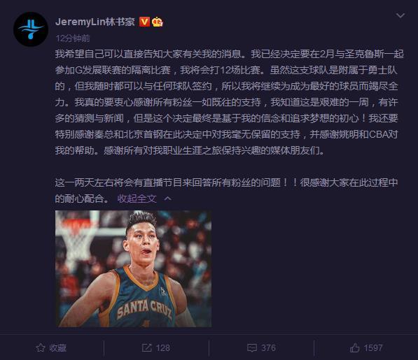 他在個(gè)人社交媒體寫道:我希望自己可以直接告知大家有關(guān)我的消息。我已經(jīng)決定要在2月與圣克魯斯一起參加G發(fā)展聯(lián)賽的隔離比賽,我將會(huì)打12場比賽。雖然這支球隊(duì)是附屬于勇士隊(duì)的,但我隨時(shí)都可以與任何球隊(duì)簽約,所以我將繼續(xù)為成為最好的球員而竭盡全力。