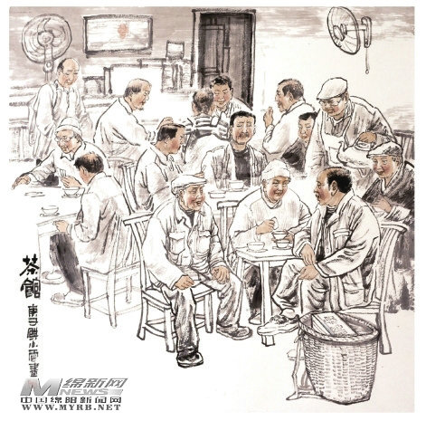 還有一幅《茶館》,聚焦的是一群衣著普通的老人,他們就著一杯茶聊天、打撲克,以此消磨時(shí)間。這樣的場(chǎng)景,是典型的四川市井文化,也是很多鄉(xiāng)下老人最喜歡的娛樂(lè)生活。