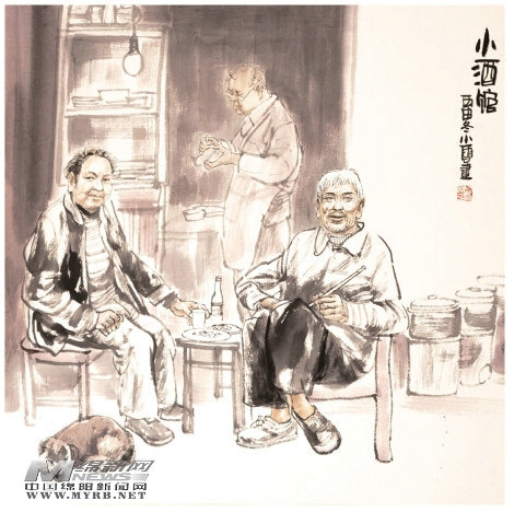 在展覽作品中,最引人注意的是一組市井生活圖像。比如那幅《小酒館》,是鮮小云2018年在三臺(tái)縣城采風(fēng)時(shí)看到的,老板正在酒館里夾豬毛,門(mén)口兩位食客正在喝酒,一個(gè)抽旱煙,一個(gè)身旁就是蜂窩煤爐子,“環(huán)境實(shí)在是有點(diǎn)差,但畫(huà)中的人都很滿(mǎn)足”。鮮小云說(shuō),現(xiàn)在人們的生活好了,但很多人卻越來(lái)越難以感覺(jué)到幸福,畫(huà)中老人們的幸福感是“有點(diǎn)小酒喝就知足了”,其實(shí)這就是幸福,“越簡(jiǎn)單越幸福”。