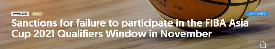 瑞士當(dāng)?shù)貢r(shí)間1月19日,國(guó)際籃聯(lián)宣布,由于中國(guó)、中國(guó)臺(tái)北和韓國(guó)三個(gè)籃球協(xié)會(huì),未能派隊(duì)參加2021年FIBA亞洲杯2020年11月第二個(gè)窗口期預(yù)選賽比賽,國(guó)際籃聯(lián)將對(duì)上述三個(gè)亞洲籃球協(xié)會(huì)進(jìn)行處罰。