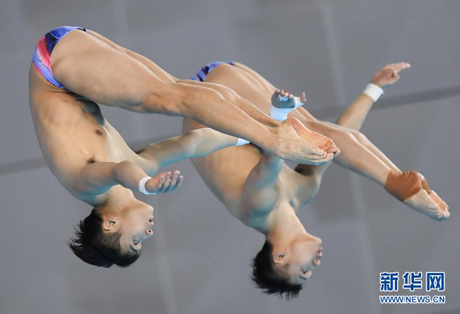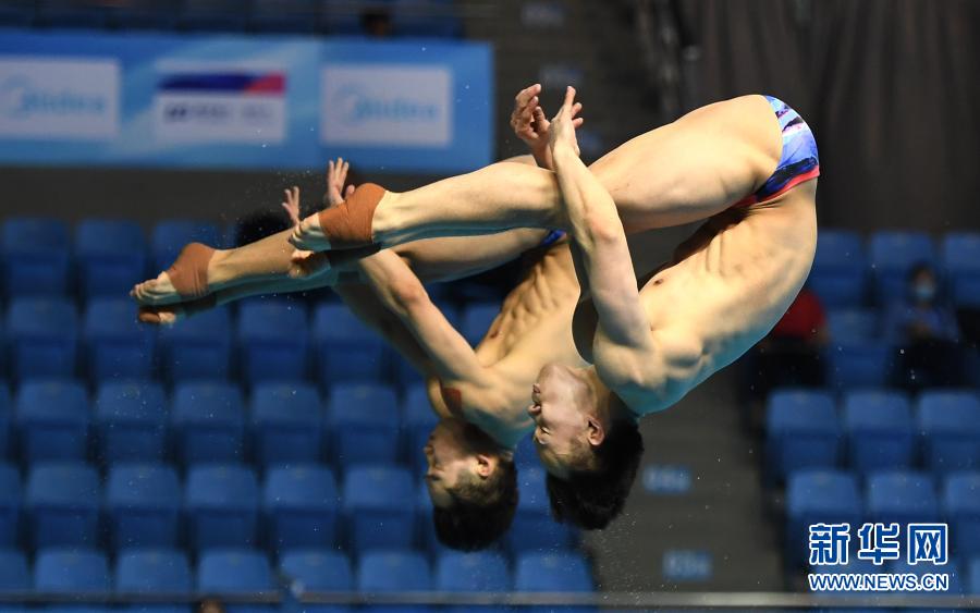 1月21日,廣東海印隊選手謝思埸(右)/湖北浩沙隊選手王宗源在男子雙人3米跳板決賽中。最終,他們以504.24分的成績獲得冠軍。