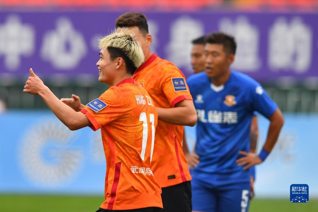 10月14日,武漢隊(duì)球員黃紫昌(左)在比賽中慶祝進(jìn)球。