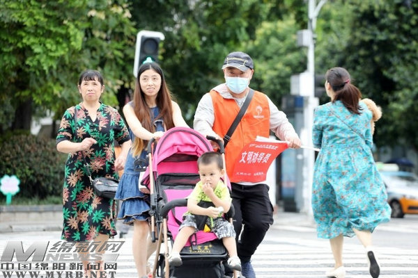 文明勸導(dǎo)員維護(hù)交通秩序(綿陽日?qǐng)?bào)社融媒體記者陳冬冬攝)