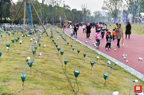 4日16時(shí),暖陽(yáng)和煦。記者來(lái)到三江創(chuàng)享廣場(chǎng)看到,各類(lèi)景觀小品相互映襯,一步一景,不少市民朋友三三兩兩結(jié)伴游玩。迷宮、投籃、大象套圈……廣場(chǎng)內(nèi)豐富多彩的游園活動(dòng)讓孩子們玩得樂(lè)而忘返。“這個(gè)燈太神奇了,可以吐泡泡。”在兒童游樂(lè)區(qū),智慧泡泡樹(shù)下吸引了不少人。18時(shí),文藝表演在開(kāi)場(chǎng)鼓《盛世鼓舞》中拉開(kāi)序幕。