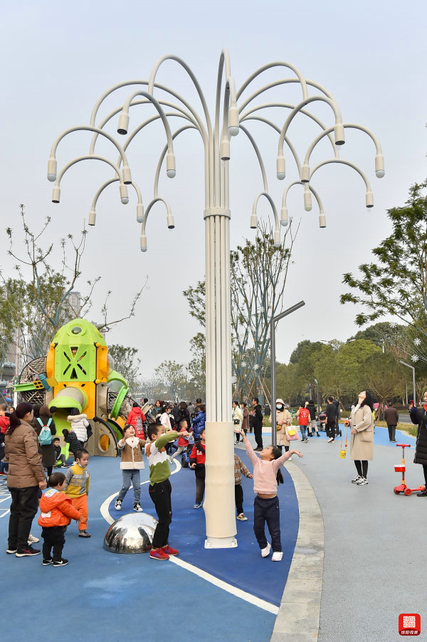 智慧休閑區(qū)設(shè)置有噴泉水景、智能健身設(shè)施,項(xiàng)目水景及綠化維護(hù)用水均采用臨近污水處理廠處理達(dá)標(biāo)后的中水,有效實(shí)現(xiàn)水資源的循環(huán)再利用。商業(yè)活動(dòng)區(qū)、兒童活動(dòng)區(qū)以透水鋪裝為主,配合周邊商業(yè)鋪裝空間,配置搖搖樂(lè)、蹺蹺板、兒童活動(dòng)滑梯、泡泡樹(shù)等趣味設(shè)施。