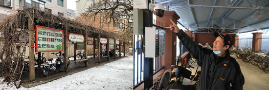 沈陽市和平區(qū)三好街103號院“老舊小區(qū)”改造前后對比圖。(左圖為小區(qū)改造之前的舊車棚,2021年3月21日攝;右圖為改造后的有監(jiān)控可以給電動車充電的新車棚,2021年11月24日攝)新華社記者 楊青攝