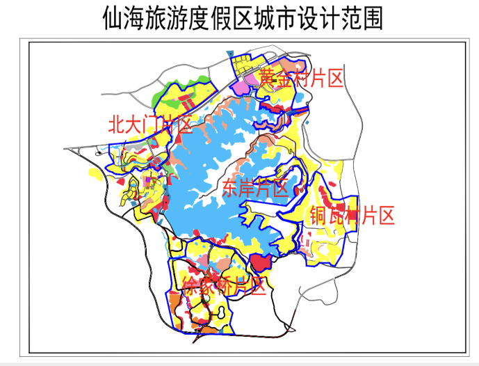 本項目主要設計內(nèi)容為對仙海北大門片區(qū)、黃金村片區(qū)、徐家橋片區(qū)、銅瓦片區(qū)及東岸片區(qū)進行方案設計(見附圖),總面積約15平方公里。設計內(nèi)容含總體定位、功能布局、空間形態(tài)、公共配套設施、業(yè)態(tài)布局、風貌管控等設計。具體設計范圍和設計要求。