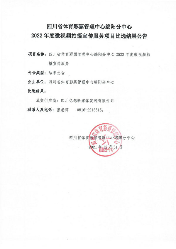 四川省體育彩票管理中心綿陽分中心2022年度微視頻拍攝宣傳服務(wù)項(xiàng)目比選結(jié)果公告