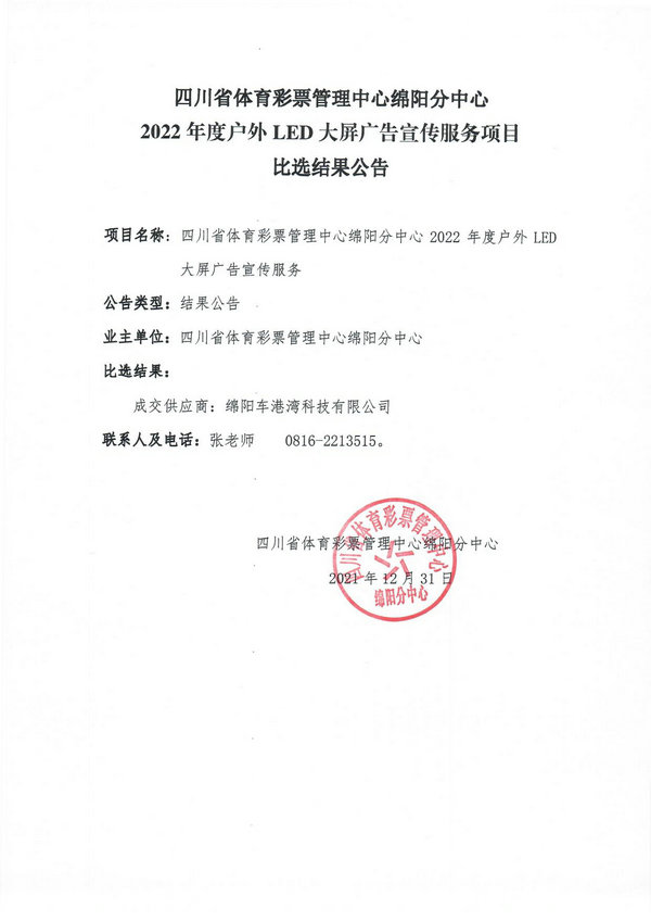四川省體育彩票管理中心綿陽分中心2022年度戶外LED大屏廣告宣傳服務(wù)項目比選結(jié)果公告