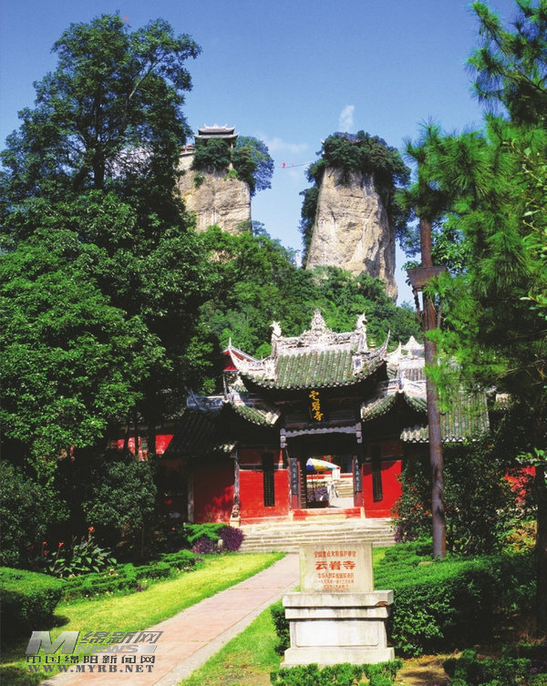 云巖寺又名“云巖觀”,融道教和佛教為一體。它位于竇圌山中部,背依三座奇峰,東傍懸崖峭壁,西鄰綠樹叢林,面對江油古城武都?!陡⒔z韻:綿陽不可移動文物》記載:云巖寺坐北朝南,現(xiàn)存建筑依中軸線布局,建有山門、文武殿、護法殿、大雄殿和振經(jīng)樓。兩側(cè)有飛天藏殿、經(jīng)堂、禪房、客房等建筑,面積達5051平方米。