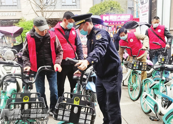 黨員志愿者在警鐘街規(guī)范街面共享單車