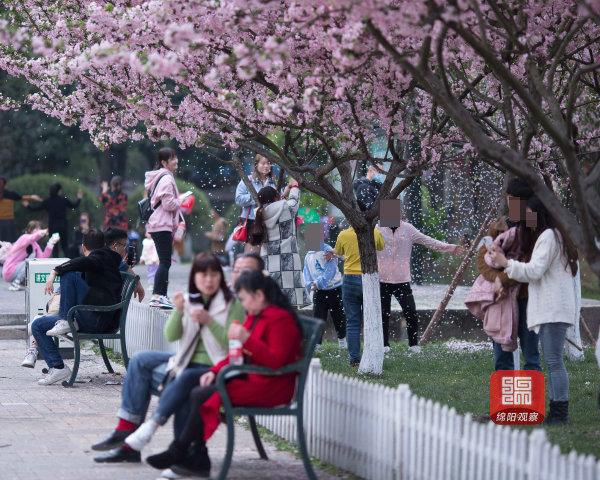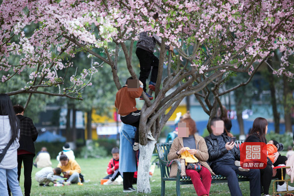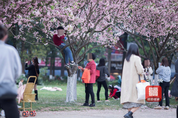 3月13日,綿陽日報社視覺綿陽“拍客”在文化廣場噴泉處記錄了幾幅“美照”,畫面中的“主角”可謂是丑態(tài)百出。她們?yōu)榱烁惺芑ò觑h飛落英繽紛的美景,拼命地?fù)u晃樹干,致使剛剛開放的花瓣撒落一地;一些小孩在家長的“協(xié)助”下,攀爬上樹枝。在這花瓣雨中,傳來陣陣歡笑聲……