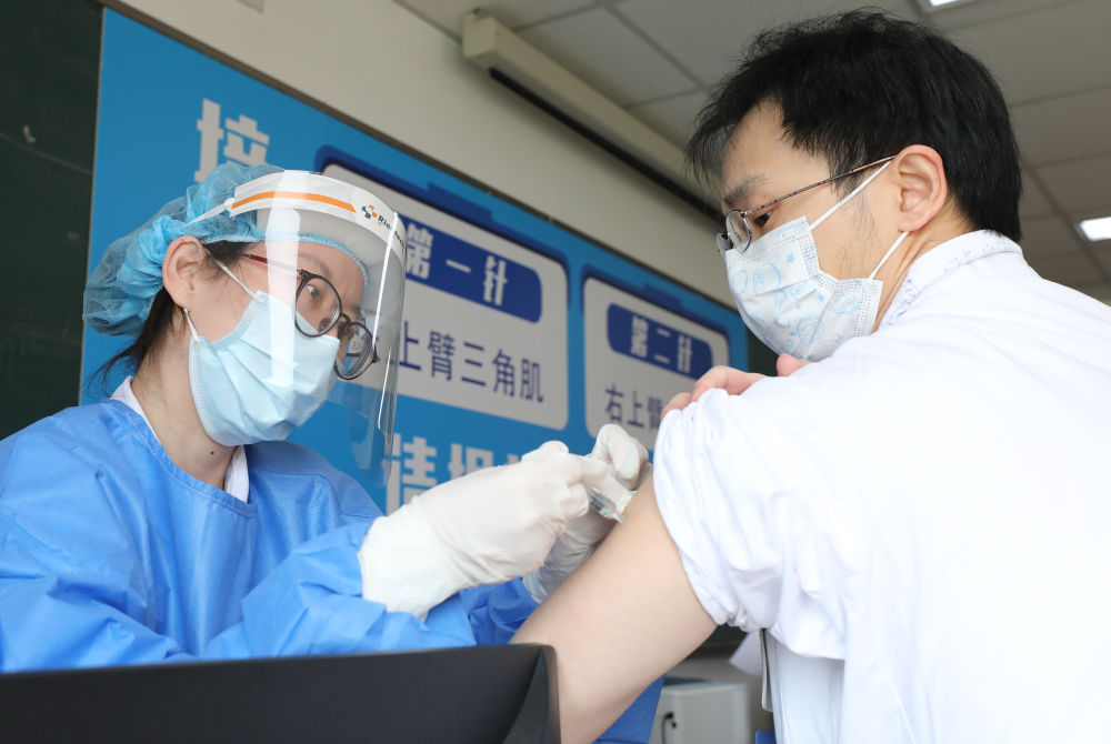 ↑3月29日,上海醫(yī)務(wù)人員為一名外籍人士接種疫苗。新華社記者 袁全 攝
