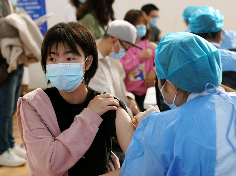 ↑3月28日,在華東師范大學(xué)閔行校區(qū)體育館內(nèi),學(xué)生在接種新冠疫苗。新華社記者 劉穎 攝