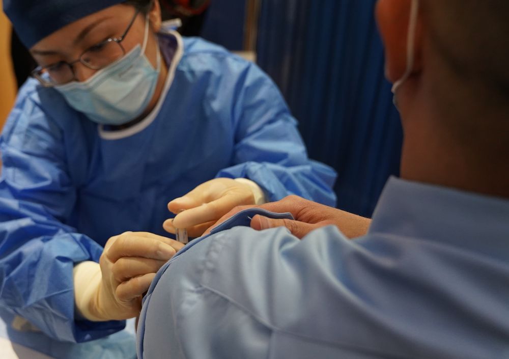 ↑3月24日,醫(yī)務(wù)人員在上海仁濟(jì)醫(yī)院東院區(qū)進(jìn)行新冠疫苗接種。新華社記者 方喆 攝