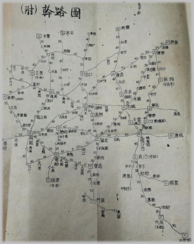 1933年11月中華蘇維埃共和國臨時中央政府內務人民委員部發(fā)布的《中央政府修路計劃》所附干路圖。(資料圖片)