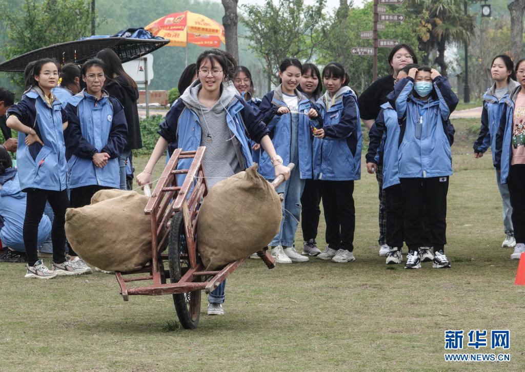 4月27日,中學(xué)生在推獨輪車競賽中。