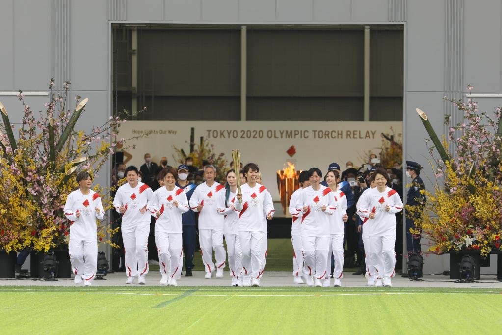 3月25日,東京奧運(yùn)會(huì)火炬?zhèn)鬟f在日本福島國(guó)家足球訓(xùn)練中心拉開(kāi)帷幕,在2011年德國(guó)女足世界杯中奪冠的日本女子國(guó)家隊(duì)部分成員成為第一棒火炬手。(新華社記者杜瀟逸攝)