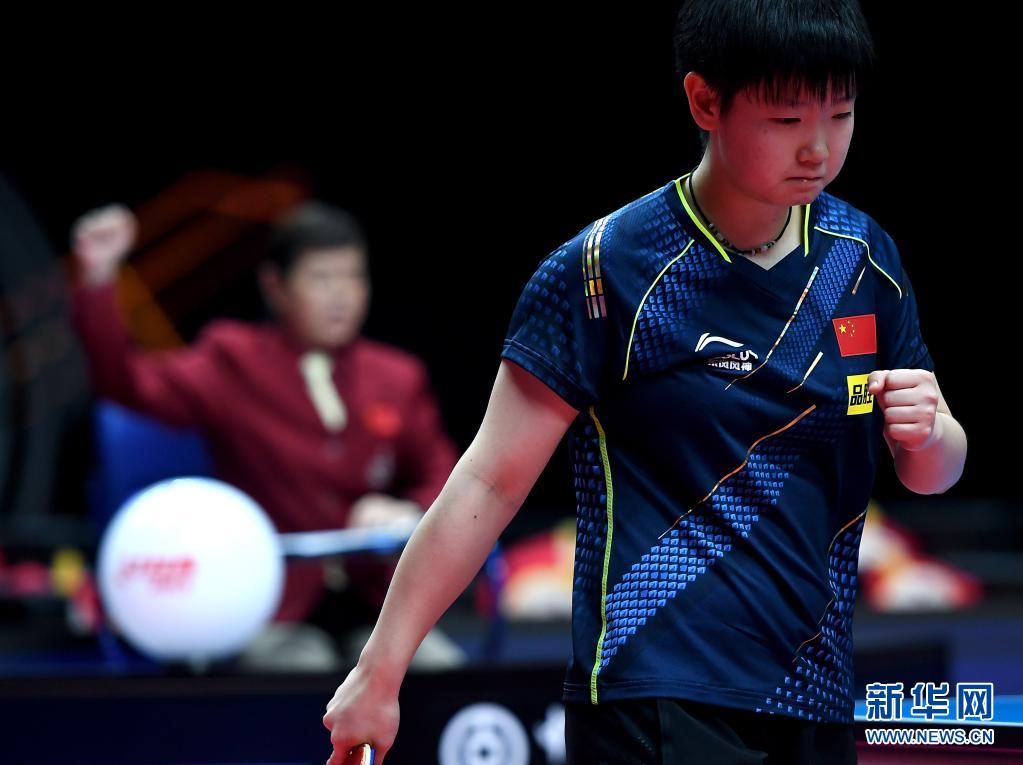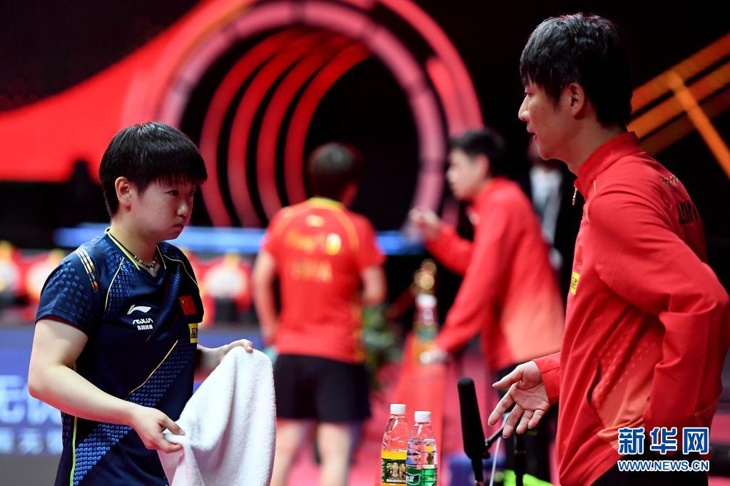5月6日,孫穎莎(左)在比賽中與教練交流。
