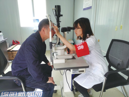 醫(yī)務(wù)人員為工人進(jìn)行眼部健康檢查