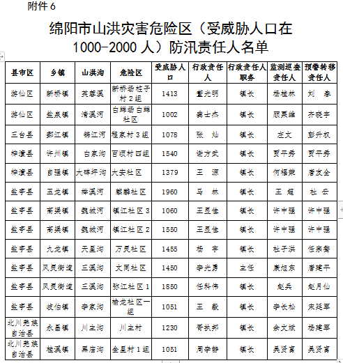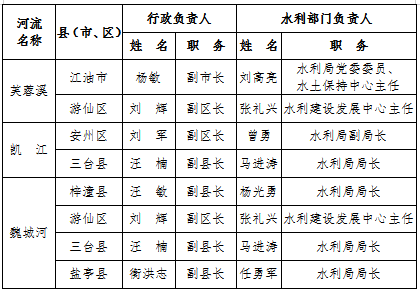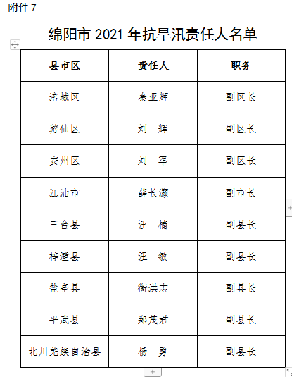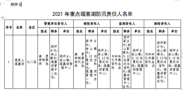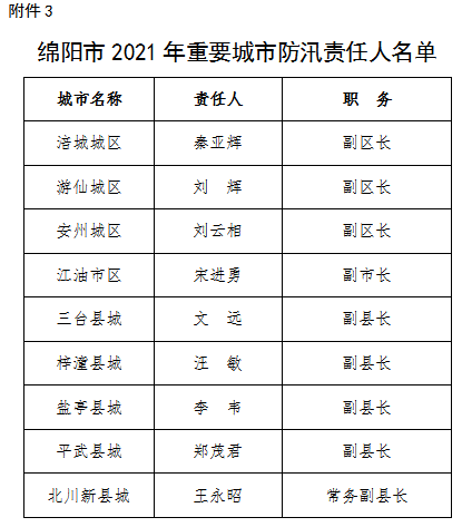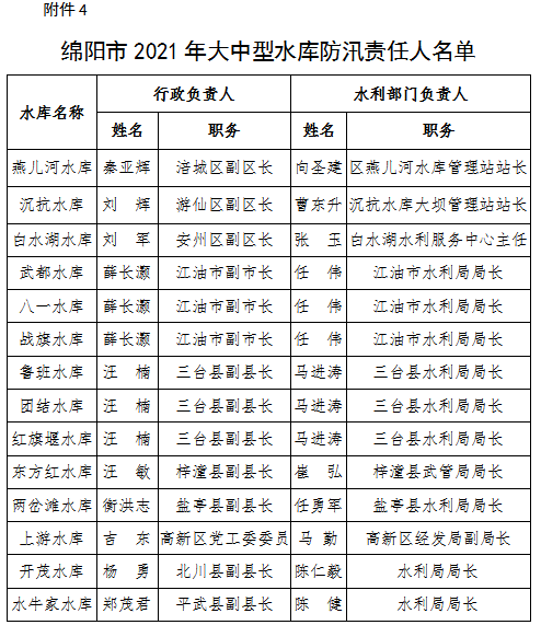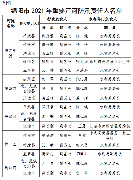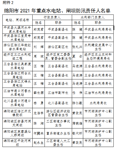 為全面壓緊壓實防汛抗旱工作責(zé)任,扎實做好2021年防汛抗旱減災(zāi)工作,根據(jù)《中華人民共和國防洪法》《四川省〈中華人民共和國防洪法〉實施辦法》等法律法規(guī)規(guī)定,現(xiàn)將我市重點江河、水電站、閘壩、重點城市、大中型水庫、重點堰塞湖、山洪危險區(qū)(受威脅人口在1000-2000人)等防汛責(zé)任人和抗旱責(zé)任人名單予以公告。防汛責(zé)任人因工作調(diào)整變更的,由后任自動接替,不再另行公告。