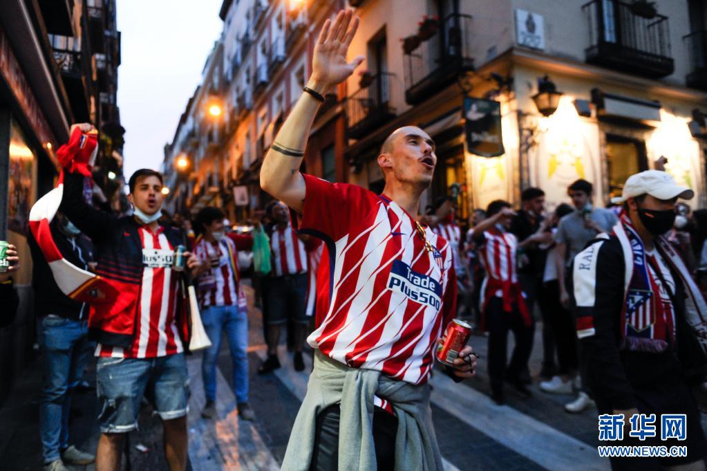 5月22日,馬德里競技隊球迷在馬德里街頭慶祝球隊奪冠。