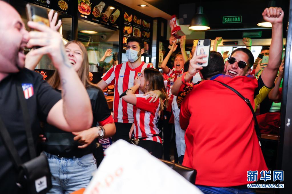 5月22日,馬德里競技隊球迷在馬德里一家酒吧內(nèi)慶祝球隊奪冠。