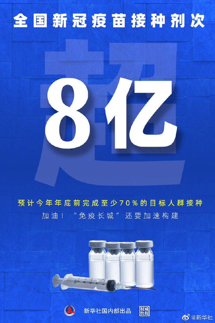 國(guó)家衛(wèi)健委6月9日通報(bào),全國(guó)新冠疫苗接種已超過(guò)8億劑次,免疫屏障正在加速構(gòu)建。國(guó)家衛(wèi)健委負(fù)責(zé)人近日接受新華社記者專訪時(shí)表示,預(yù)計(jì)年底前至少70%目標(biāo)人群接種疫苗。共筑“免疫長(zhǎng)城”,我們還要繼續(xù)努力。(徐鵬航、陳席元;海報(bào)設(shè)計(jì)張晨光) ????