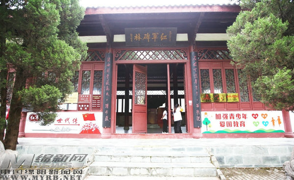 在平武縣北山公園內(nèi),有一座仿古式建筑,高大的臺(tái)基,朱紅色的門柱和窗戶,配以純白色的外墻,顯得格外莊嚴(yán)肅穆,這就是平武紅軍碑林館,里面保存著很多紅軍的石刻標(biāo)語(yǔ)。